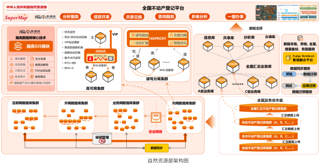 全国不动产登记平台采取以不动产登记库为核心,对30+个省、300+个市、2800+个县的技术架构进行设计,按“平台—信息库群—数据库群—存储”的层次结构,采用瀚高数据库的高可用、读写分离集群部署架构,瀚高数据库安全版、统一密钥管理平台和多层数据加密下的集成策略和定时自动化备份的综合解决方案,完全满足海量全国不动产登记数据的安全保密和高能高效的双重需求,通过业务协同、共享查询、统计分析等功能,给全国不动产登记海量时空数据在复杂应用场景下的管理和应用提供稳定、高性能数据支撑。