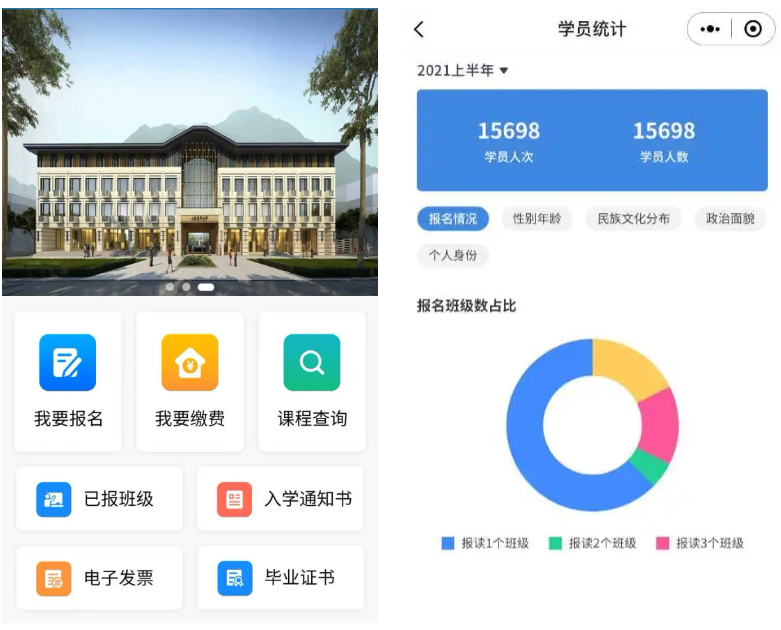 针对老年大学招生规则灵活、排课易冲突等问题,创新研发“自定义规则引擎 + 智能协同系统”实现全流程自动化。° 支持年龄要求、特殊班级考核报名等个性化规则,满足不同班级的招生需求° 分阶段招生机制可预设提前批、常规批、补录批启停时间,无需人工值守即可自动切换报名通道,今年山东老年大学补录通道精准开放,效率提升 90%° 首创“六维课表联动”,实时同步班级、教师、教室、班主任、学期总表以及周次课表的数据并自动识别冲突,消除人工排课错误° 系统实现服务全流程线上化,学员通过小程序完成报名、请假、转班、退费等操作,无需线下跑腿° 教师薪酬根据自定义公式(课时费标准、等级系数、考勤奖惩等)自动核算,电子证书一键下载,便捷银发群体畅享“数字校园”。