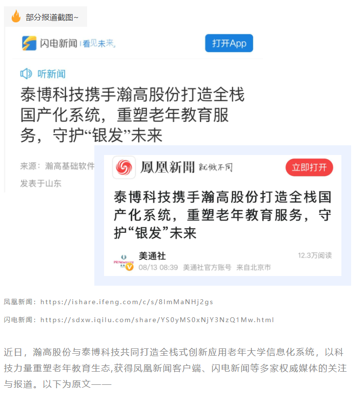 ° 领导驾驶舱 3.0 动态可视化呈现招生率、课程热度等 15 类核心指标,为决策提供数据支撑° 电子班牌实时同步课表,人脸考勤 1 秒识别,减少老年学员操作负担° 志愿服务平台实现“报名-考勤-积分兑换”全流程管理泰博科技与瀚高股份的技术协同已在山东落地生根。山东老年大学正式上线该系统,今年6月份在近 1 万用户高并发招生中,报名、缴费、分班全流程顺畅完成,排课效率提升 90%,学期故障率 < 0.1%,行政人员从重复工作中解放,得以聚焦教学质量提升。同时,济南老年人大学正在部署该系统,预计今年 8 月底正式投入使用。届时,济南的老年学员将体验到 “线上报名零跑腿、在线上课低延迟、服务全程有温度” 的数字化校园服务。从山东到全国,泰博科技与瀚高股份的合作,不仅响应了国家应用创新政策要求,更以本土化技术+场景化创新重塑了老年教育的服务形态。正如泰博技术负责人所言“这套系统让老年教育既守住了安全底线,又突破了服务边界,真正实现了让每个银发身影都能共享数字红利”。未来,随着更多老年大学的加入,全栈应用创新的“智慧银龄”生态将持续扩容,为千万老年人的 “终身学习” 梦想插上科技翅膀。