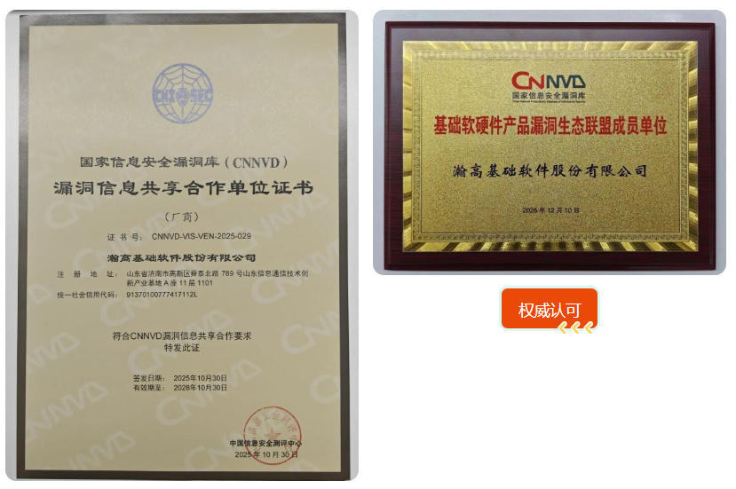 大会期间,瀚高数据库凭借在漏洞治理与安全生态建设方面的持续贡献,获颁由国家信息安全漏洞库(CNNVD)与中国信息安全测评中心授予的国家信息安全漏洞库(CNNVD)“漏洞信息共享合作单位”,并正式加入由中国信息安全测评中心牵头成立的“基础软硬件产品漏洞生态联盟”。荣获两项国家级权威认可,充分体现了瀚高数据库在数据库安全防护与整体安全保障方面的综合实力。