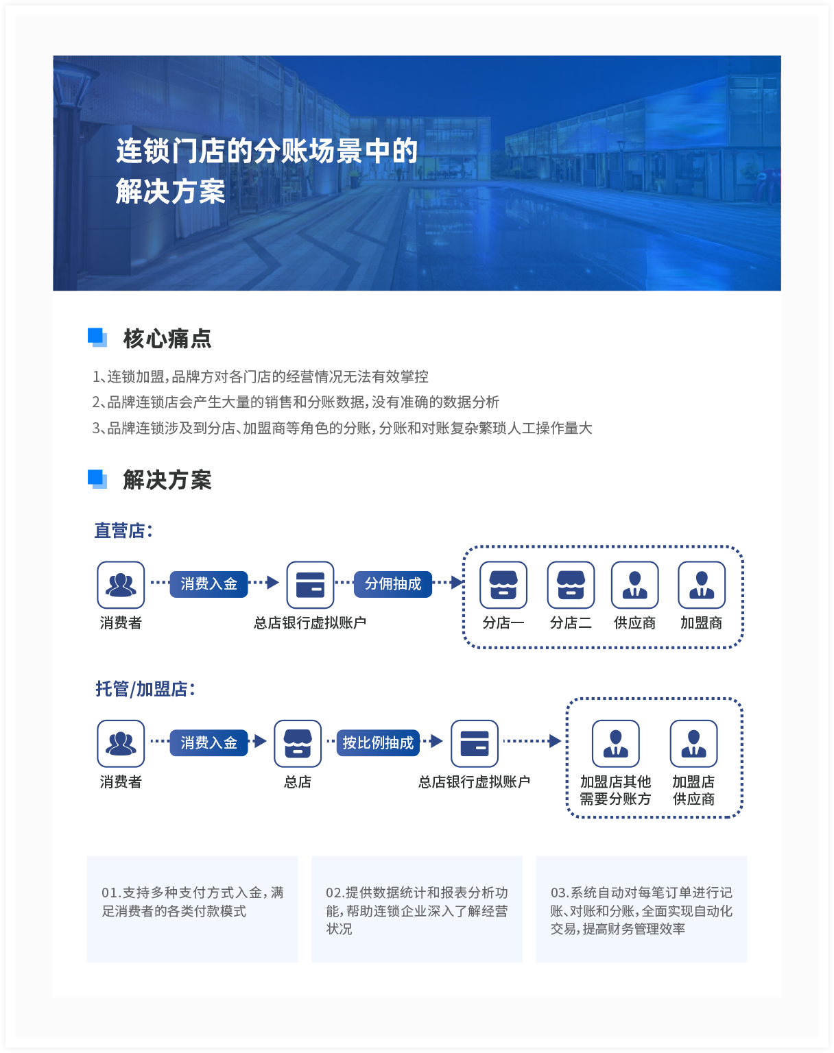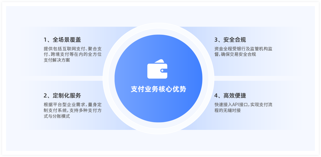 互联网支付是数字经济商业逻辑的最基础。在互联网时代,往往单一支付产品无法满足类似平台型企业、连锁行业、供应链管理行业、外贸行业、服贸行业需要的便捷、大额支付、规跨境收付、多级分账、复杂分账以及财税务合等要求。聚合支付服务则能为这类场景提供合理的解决方案。